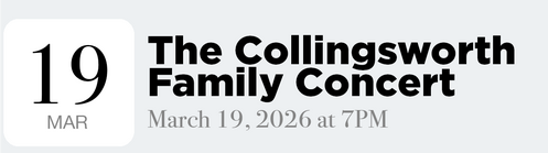 Join us for an incredible night of music with The Collingsworth Family. Known for their stunning harmonies and heartfelt worship, this award-winning family will inspire your faith and lift your spirit through an unforgettable concert of praise.
