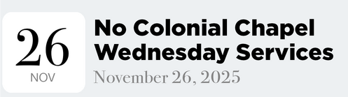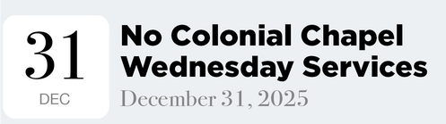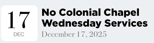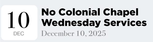 There will be no adult Wednesday services in Colonial Chapel for the entire month of December as we prepare for Christmas Fest and our holiday services. However, please join us online at 7PM on YouTube or Facebook for a special Wednesday service. Kids and Youth services will continue as usual.